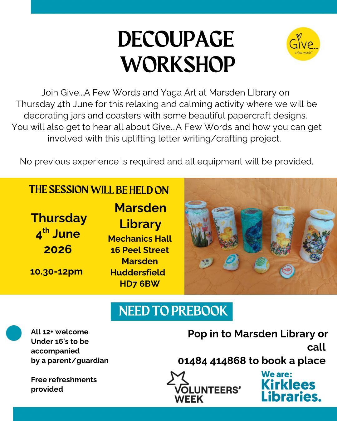 Join Give…A Few Words and Yaga Art on the 4th June for a calming Decoupage workshop decorating jars and coasters.