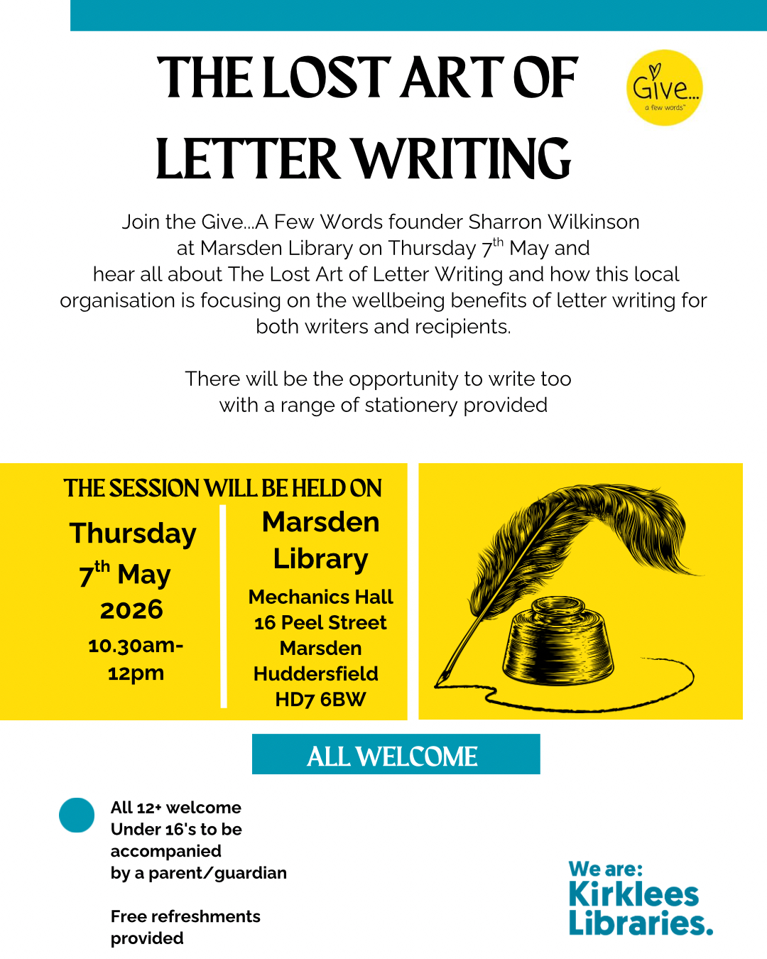 Join us at Marsden Library on Thursday 7th May for a fun and relaxed session Introducing Give…A Few Words and “Exploring the Lost Art of Letter Writing”.